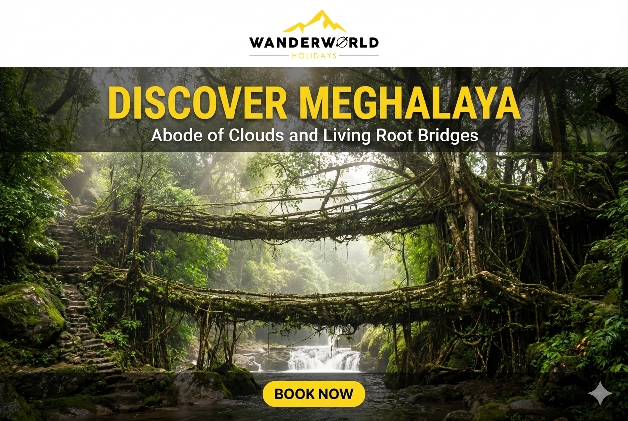 Discover the enchanting beauty of Meghalaya with its lush waterfalls, rolling hills, mystical valleys, and the famous living root bridges. Experience nature exploration and adventure activities in the abode of clouds.