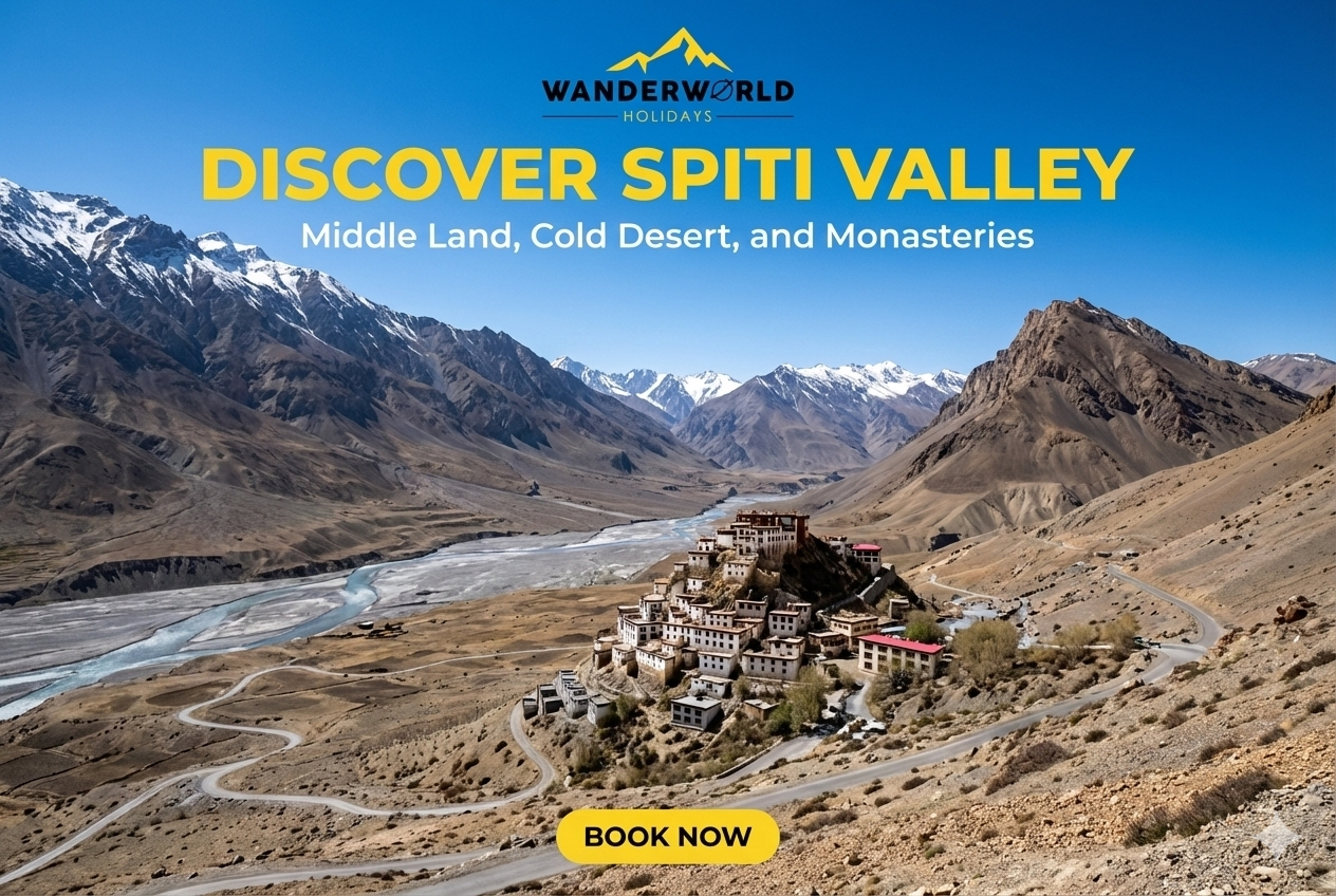 Experience the mystical winter landscape of Spiti with snow-capped mountains and ancient monasteries.